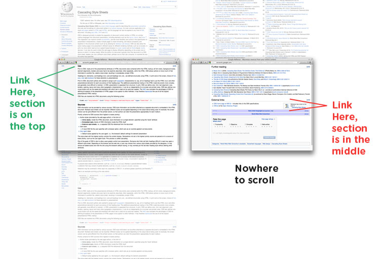 I’m not just making that up. From personal experience, page-jumping links that don’t take me to somewhere where was I was linking to is exactly on the top, I get all out of sorts. I find it happens all to often on things like FAQ pages where the linked-to sections often aren’t very tall.