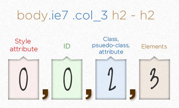 Great article on CSS specificity! An explanation isn’t even necessary, the pics suffice. But Chris, in light of Eric Meyer’s correction, why don’t you fix your pics? Remove the pluses and add the commas.